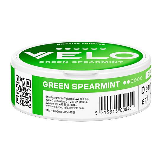 VELO Green Spearmint levereras i ett slim-format, vilket innebär att prillorna är smalare än standard och sitter diskret under läppen. Produkten är helt tobaksfri och tillverkad av British American Tobacco (BAT). Prillorna är utformade med en torr yta och ett fuktigt innehåll, vilket säkerställer låg rinnighet och en gradvis frisättning av både smak och nikotin. Med en nikotinhalt på 5,6 mg per portion ger den en behaglig och jämn upplevelse för daglig användning.