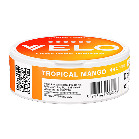 VELO Tropical Mango levereras i ett slim-format, vilket innebär att prillorna är smalare än standard och sitter diskret under läppen. Produkten är helt tobaksfri och tillverkad av British American Tobacco (BAT), vilket garanterar en hög och jämn kvalitet i varje prilla. Med en nikotinhalt på 5,8 mg per portion ger den en balanserad och behaglig upplevelse som passar perfekt för daglig användning.