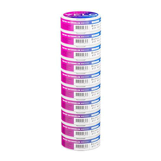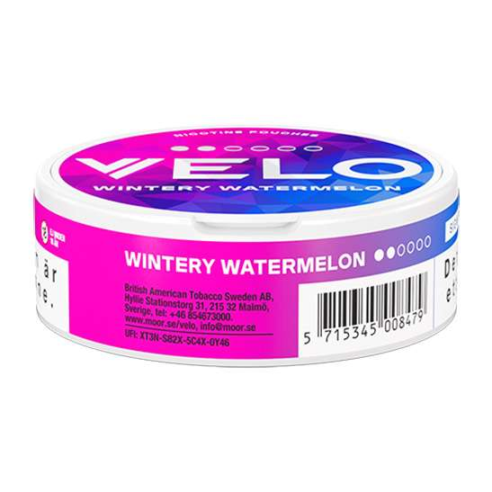 VELO Wintery Watermelon levereras i ett mini-format, vilket är VELO:s mest kompakta prilla, framtagen för att sitta helt osynligt och bekvämt under läppen. Produkten är helt tobaksfri och tillverkad av British American Tobacco (BAT), vilket garanterar en hög och jämn kvalitet med en hållbarhet på ca 12 månader. Med en nikotinhalt på 6 mg per portion ger den en behaglig och balanserad upplevelse som passar perfekt för daglig användning när diskretion är högsta prioritet.